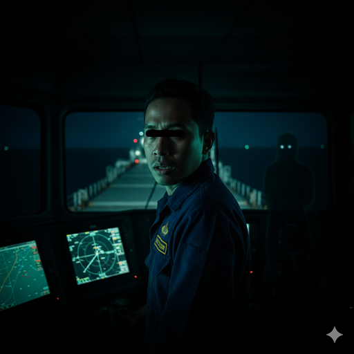 Malam itu, jam menunjukkan pukul 02.00 dini hari. Lautan membentang gelap, hanya diterangi cahaya bintang dan lampu navigasi kapal. Saudara Anton (bukan nama sebenarnya), seorang Mualim yang bertugas jaga di anjungan (bridge), merasakan keheningan yang luar biasa. Hanya suara mesin kapal yang monoton menemani kesendiriannya.