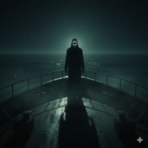 Anton memutuskan untuk memeriksa area dek, sekadar memastikan tidak ada kru yang berkeliaran atau ada masalah di luar. Begitu ia melangkah ke luar anjungan dan menyusuri dek samping, pandangannya tertuju pada ujung haluan kapal. Samar-samar, di kegelapan, ia melihat sesosok bayangan hitam tinggi berdiri tegak.